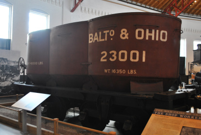 Baltimore and Ohio iron pot hopper 23001 built by the railroad in the 1880's. In 1842, the B&O Railway had reached the base of the Alleghenies, a range of the Appalachian Mountains, which increased the railroad's coal shipments east. To keep up with this increasing amount of traffic, the B&O created a circular hopper made of iron.