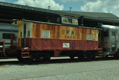 Western Maryland caboose 901803, nee Western Maryland 1803 built by the railroad in 1936. It maintained its red and white coloring until the 1970's, when black was added. In 1976, the 1803 was transformed into a safety caboose after the railroad was acquired by the Chessie System for their "safety first" campaign. In 1982 the 1803 caboose became the 901803 and its paint scheme was again changed to green and sported the slogan: "Near miss program. Are you doing your part?" By the 1990's, the 901803 was one of two original Western Maryland cabooses still in use by the newly merged CSX service. By 2002, it no longer passed inspection and was retired and restored to its original appearance for the 150th anniversary of Western Maryland.