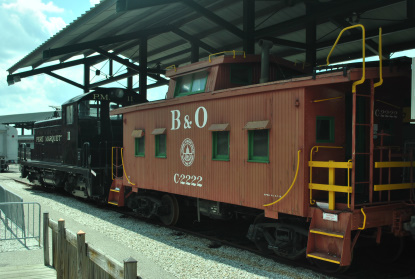 Baltimore & Ohio Railroad wooden bobber caboose C-2222 built by the railroad in 1929, one of 272 such cabooses built over a five-year period. Beginning in 1940, some of these were modified to be used for pusher (shoving) service. C-2222 was rebuilt with a concrete floor and increased width and wheelbase, providing strength to protect the caboose from being crushed between the weight of the train and the pusher engine. In 1957, C-2222 was converted into a Class I-5D: 33 feet long, almost 10 feet wide and weighing 62,700 pounds then in 1970, was repainted with Chesssie System yellow and used for mine service. It was retired in 1975 and was purchased by a private owner.