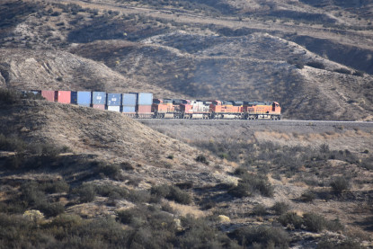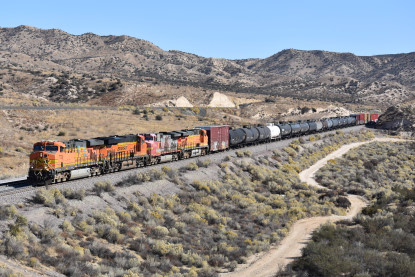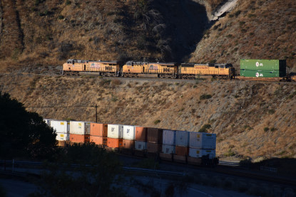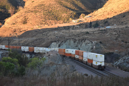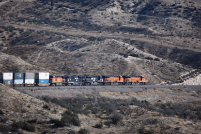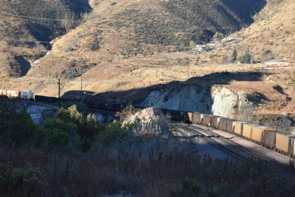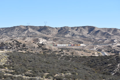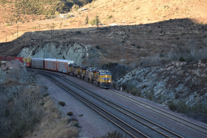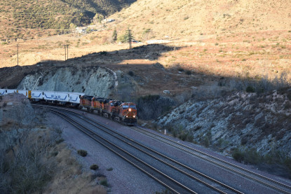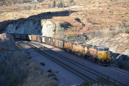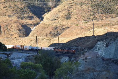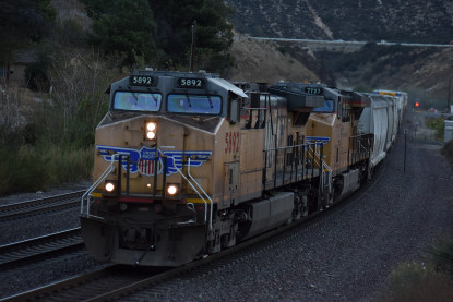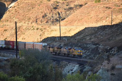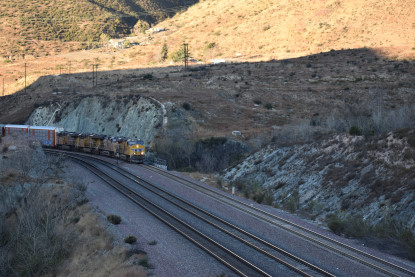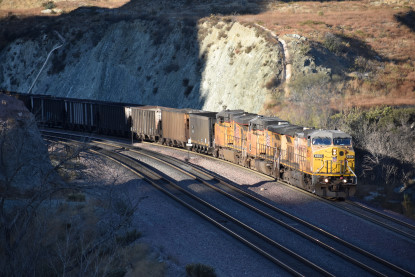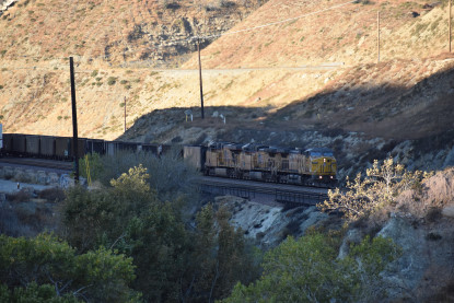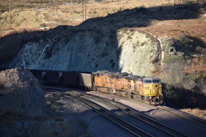 Union Pacific 5892 West. We drove down to Swarthout Canyon Road, crossed the BNSF mainline then parked and hiked across the mainline to the hill that overlooks Blu Cut. Our wait was not long.