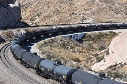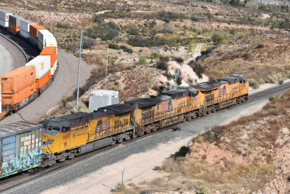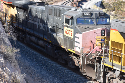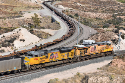Union Pacific 7646 East wIth DPUs UP C44AC 7081 and UP AC45CCTE 8066. Union Pacific 8264 West remained stopped at Canyon siding and was the first train on Sullivan's Curve.