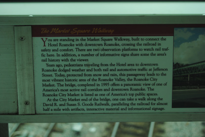 There are plaques on this bridge telling the railroad history; this one tells about the Roanoke shops. We returned just before the sky let loose and I put up my last story on the website and then on Trainorders.com. I also put the pictures from today into the computer and named them before we went down to the Pine Room Lounge where I had chicken wings and Robin enjoyed a Turkey Club House sandwich with bacon along with bread pudding with rum sauce for dessert. I returned to the room and worked on some of today's story then showered and called it a night.
