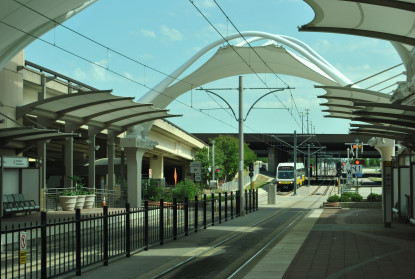 At the Las Colinas Urban Center Station, there is this guided wheel vehicle and guideway it runs on.