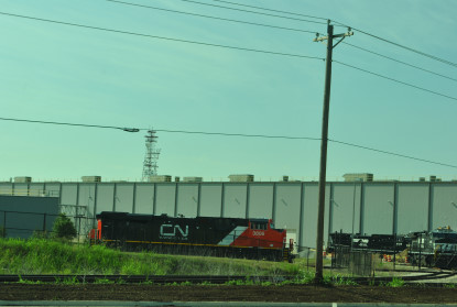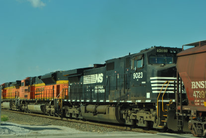 BNSF 5060 South with NS C-40-9W 9023. We continued north along Texas 156 and first saw BNSF's Alliance Yard then came the surprise of this trip when we came to the GE Fort Worth Locomotive Building, made a U-turn then parked.
