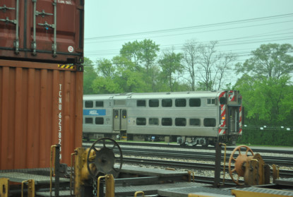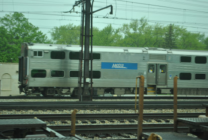 Northbound Metra Electric 806 seen through the Canadian National 2168 train.
