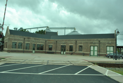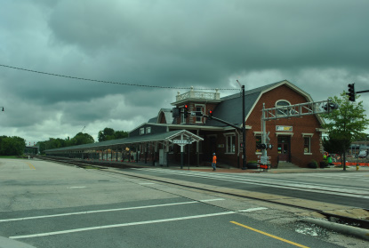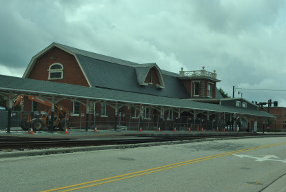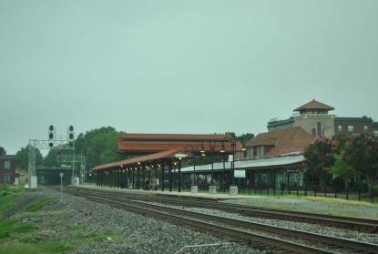 The Salisbury station, built in 1908, from the grade crossing. The train was expected at 7:45 AM and a minute before that, we saw a headlight coming down the tracks from the south.