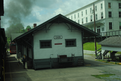 Brief History of CassThe town of Cass was always centered around the lumber companies that inhabited the valley and operated the West Virginia Pulp and Paper Mill. The mill operations were enormous during its heyday period of 1908 to 1922. It ran two 11 hour shifts six days a week, cutting 125,000 board feet of lumber each shift, an impressive 1.5 million feet of lumber a week. The Cass mill also had a drying kilns using 11 miles of steam pipe to dry 360,000 board feet of lumber with each run. The adjoining planning mill was three stories tall, measuring 96 by 224 feet. Massive elevators carried up to 5,000 feet of lumber to separate floors and machines. Some of the flooring machines took 15 men to operate them. There were two resaws that could accommodate boards up to 35 feet. The large surfacing machines finished all four sides of a board in one operations. Roy Clarkson in Tumult stimated that in 40 years the Cass mill and the mill in Spruce turned more than 2.14 billion feet of timber into pulp or lumber. The town of Cass was named after Joseph K. Cass. Each morning the C&O RR dispatched a 44 car pulpwood train for the paper mill at Covington. At the peak the West Virginia Pulp and Paper Mill employed between 2,500 and 3,000 men. In an average week six to ten carloads of food and supplies traveled over the railroad to the 12 logging camps.