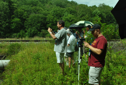 The train came to Linan in a light rain shower and some of the passengers detrained for a photo runby. The train consisted of Cheasapeake & Ohio F7A 7094, Western Maryland BL2 82, West Virginia Central United States Mail Railway Post Office 706, West Virginia Central coach and Western Maryland coach 835. We made a photo line and the edge of Linan Lake and waited for the photo runby to start.