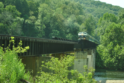Any trip on any day through "The Trough" is a great day in your life. We spotted three bald eagles and had the first one take off from a tree on our side of the river so you saw the bird's great wing span as it flew out of that tree. We crossed the Sycamore Bridge then stopped to let the passengers out of the open gondola car then backed across the bridge for the first photo runby of the day.