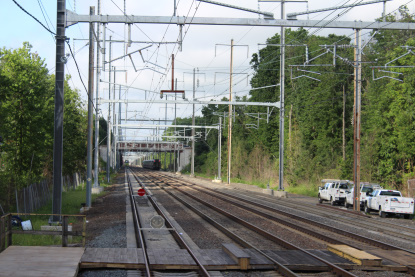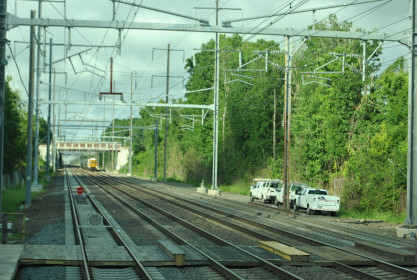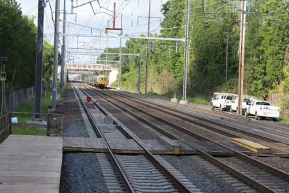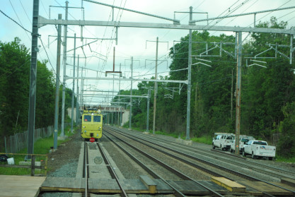 A track tamper heads out to work. The east track was out of service and a metal platform extended over that track, so Princeton Jct only had a middle track for express trains which meant that there were only three tracks instead of the normal four.