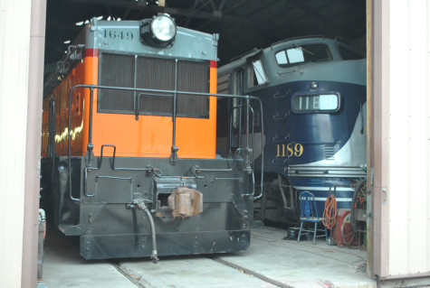 On the left is Milwaukee Road NW2 1649 built by General Motors Electro-Motive Diesel Division in 1947. This locomotive worked across the Milwaukee Road system before being retired and sold to a private party in Rockford, Illinois. The locomotive was donated to and arrived at the museum in 2000. After arrival, an operational restoration was begun that was completed in late 2003. On the right is Wabash Railway F7A 1189 built by General Motors Electro-Motive Diesel Division in 1953. Number 1189 was the last F7A ordered by the Wabash and was the last built by General Motors Division, Ltd. at London, Ontario, and spent most of its operational time in Fort Erie, Ontario. Retired in 1979, 1189 was sent to Decatur, Illinois to be scrapped but was donated to the Museum by the Norfolk and Western in 1980. After arrival at the museum, much body work was done as well as required mechanical work to return the locomotive to service.