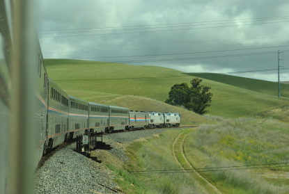 The trip across Altamont Pass. We ran across the flat San Joaquin Valley, crossing the San Joaquin River and passed through the ACE Manteca station before reaching the former Southern Pacific connection where we continued on to Lathrop.