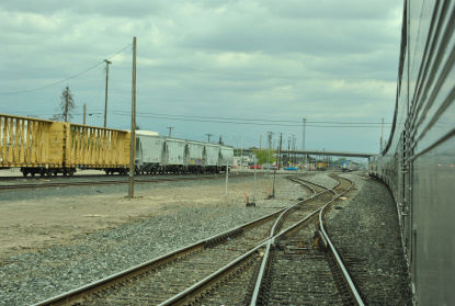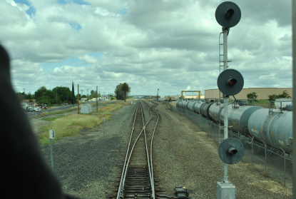 The train on the northwest leg of the wye and departed Lathrop for good at 11:18 AM. We started our sprint towards Bakersfield, running through Modesto at 11:40 AM.