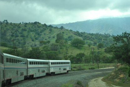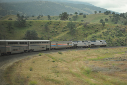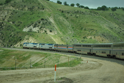The trip around the Tehachapi Loop. We made our way to Marcel followed by Cable and realized that we had met five Union Pacific freights since Bakersfield but only two BNSF freight trains. We then ran through Tehachapi and Monolith before descending to Mojave, followed by Lancaster and Palmdale before climbing to Vincent then into Soledad Canyon. We met Metrolink 269 at Lang siding and met Union Pacific 8424 West at Humphreys. We continued on to Via Princessa, Santa Clarita and Newhall before entering the San Fernando Tunnel. Exiting at 7:15 PM, the train made its way through Sylmar and Sun Valley, and upon reaching Burbank Junction, the detour was completed at 7:31 PM. We made a brief stop to unload our Union Pacific pilot crew then ran to LAUPT, arriving at 7:55 PM, thus ending the two days of unique Coast Starlight detours.