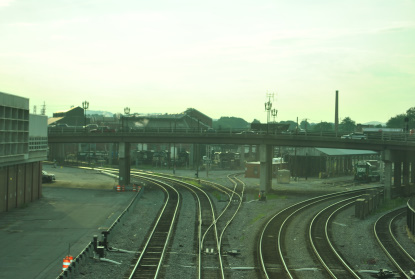 Looking east, the mainline splits with the one to the right going to Norfolk and the one to the left heading to Harrisburg. The Roanoke Shops are in the middle.