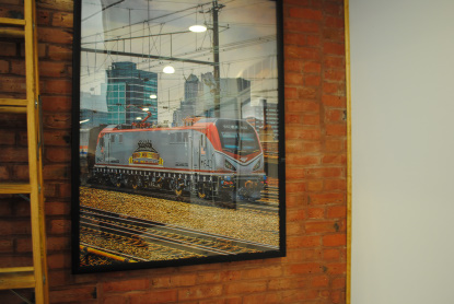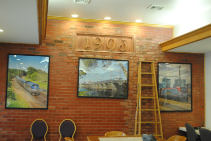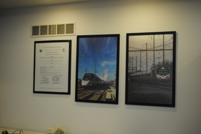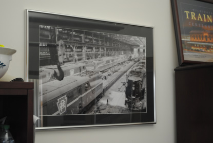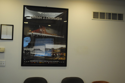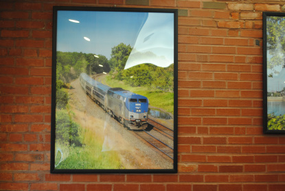 Fantastic pictures of Amtrak trains hang on the walls in this room.