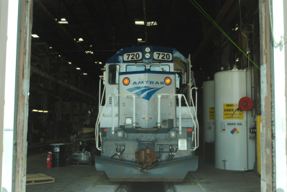 Amtrak GP38-3 720 built by EMD in 1976 in the locomotive shop bay door.