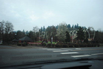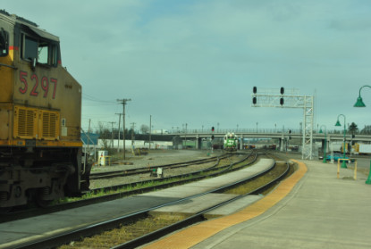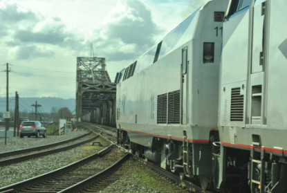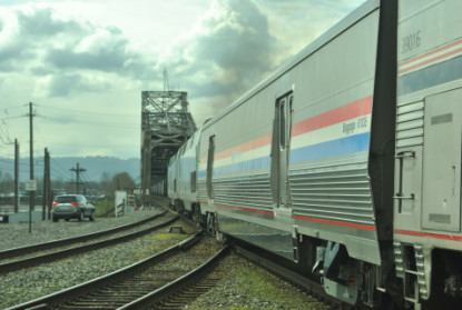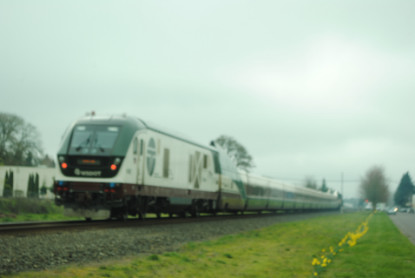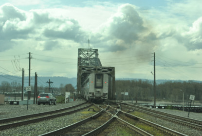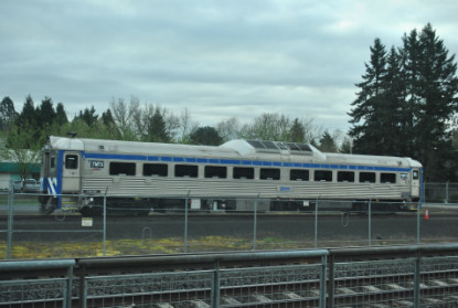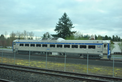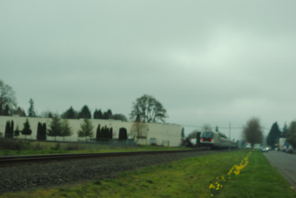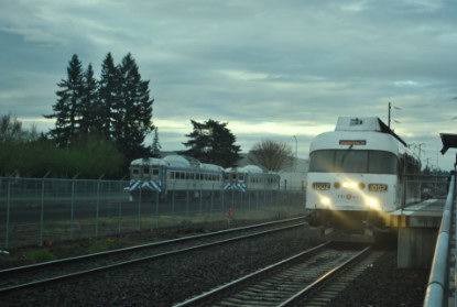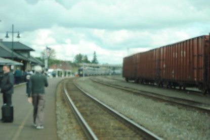 Amtrak Cascades 500 leaving Oregon City. As we drove out, I pointed out the End of the Oregon Trail conestoga wagon skeletons and took a picture of them.