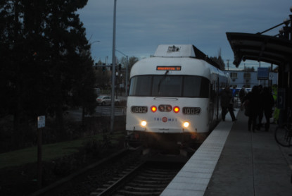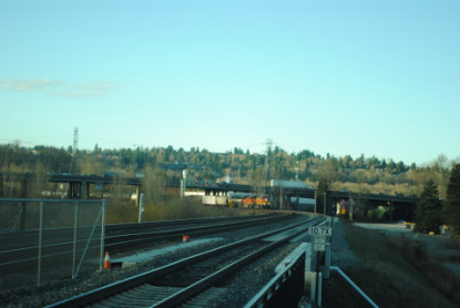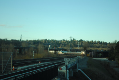 Amtrak Cascades Train 518 which picked us both up; Chris in Car 6 for Tacoma and myself in Car 5 for Tukwila. I worked on the story up to Olympia-Lacey before getting online and clearing out my e-mail. Making the most of what was most likely my last daytime trip along Puget Sound, I just enjoyed the view this time. We arrived at Tacoma and Chris detrained. We then did slow running putting my connection in danger and I went to the conductor and told them my problem, and after telling them how much I had ridden trains, they said they would get me there before the southbound train, which they did as we arrived at 6:21 PM. I found the tunnel to the other east platform and walked up to the track. I had a green signal so knew I was in the right spot. Then I saw a headlight but it was not my train.
