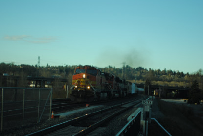 The BNSF local, led by BNSF 3009, returns from the Port of Vancouver.