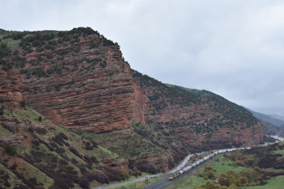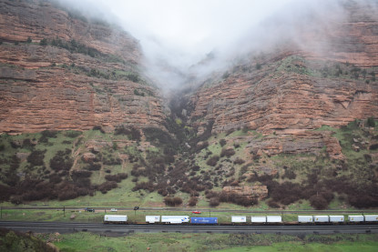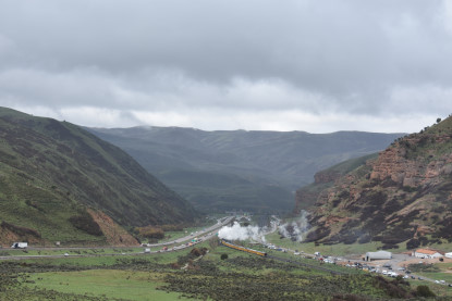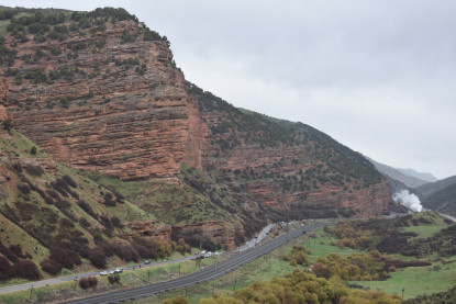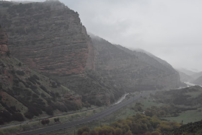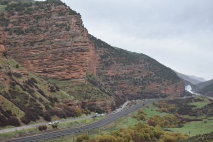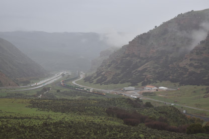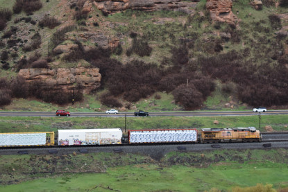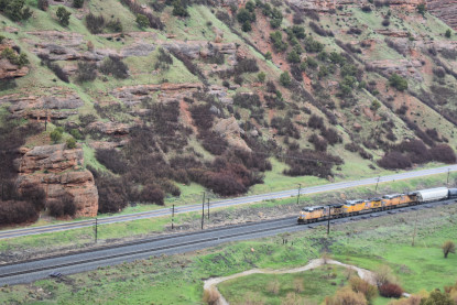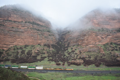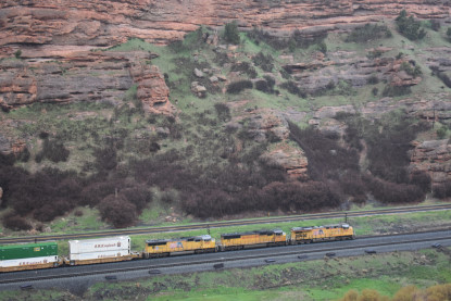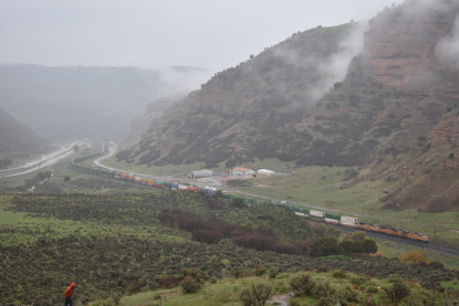 The MorningThis morning Robin and I arose at 4:45 AM and left the Radisson Hotel after 5:00 AM, driving east to the exit to Park City. We filled up my car with petrol and picked up some donuts for me to snack on then drove Interstate 80 east to Castle Gate then reversed to the westbound rest area where we parked. We waited for Bob and Elizabeth to arrive while Robin took a nap. Once the four of us were together, Elizabeth and I climbed through the wet dirt (muck) to the top of the west hill, Bob would be at the table area and Robin on the east hill. It was off and on rain with us joking that we all must be crazy to be standing here waiting for a Big Boy to arrive. We did, however, have trains to practice with.
