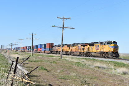 The Cedar City Union Pacific station. After I had consumed my hot cakes and sausage, I drove Utah Highway 130 and 21 to Milford and then Utah 257 where we had a train, but had no way to get a picture of it. So we proceeded on to Delta, taking US 6 to north of Lynndyl, where north of there we had a Union Pacific stack train reversingwith two crew members on the rear platform.