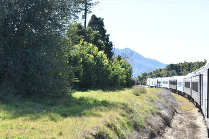 The train dropped down Bellio Hill to the grade crossing of CA Highway 124.