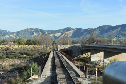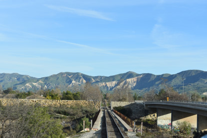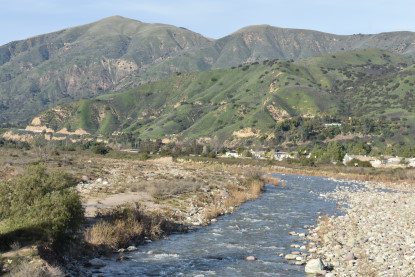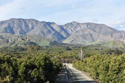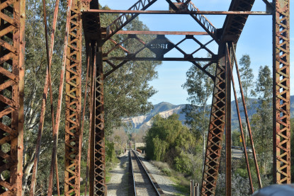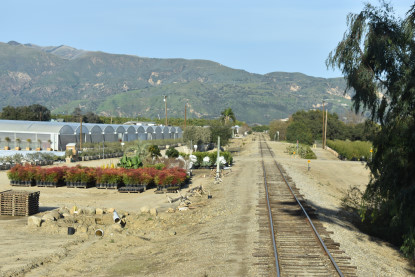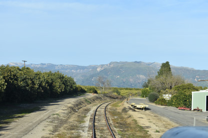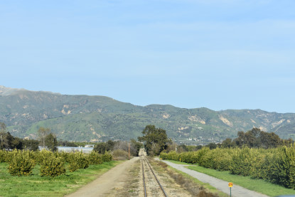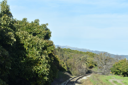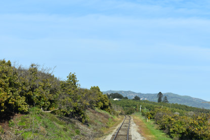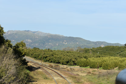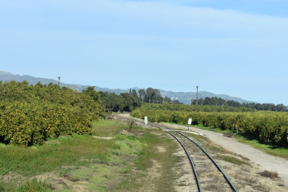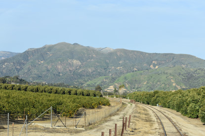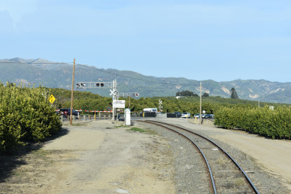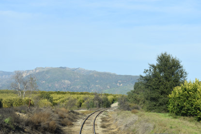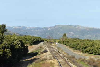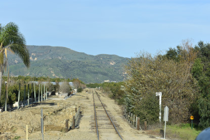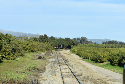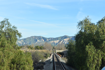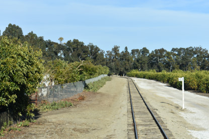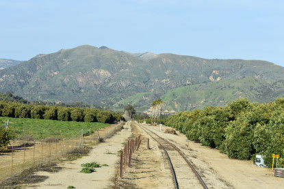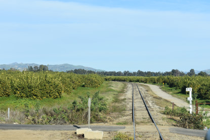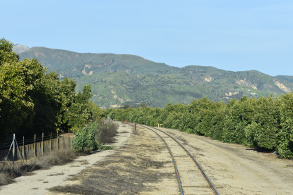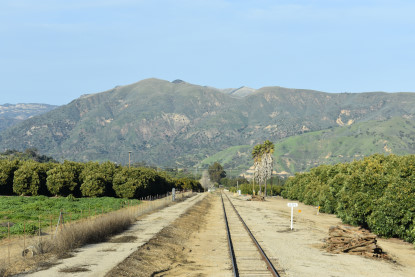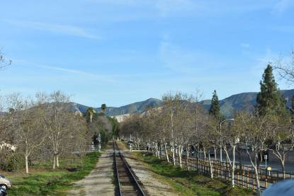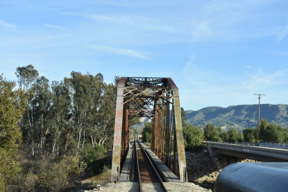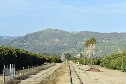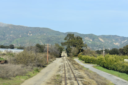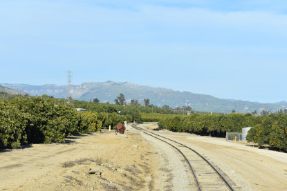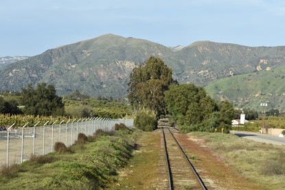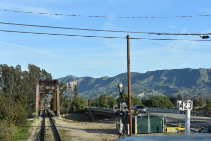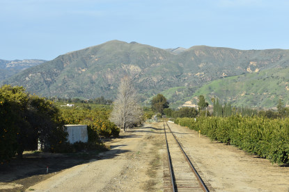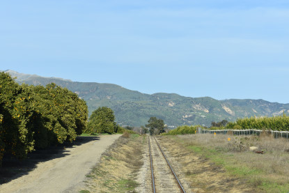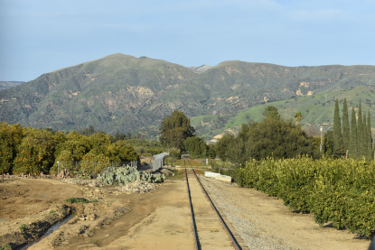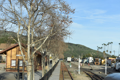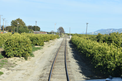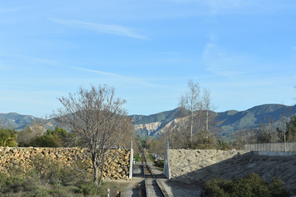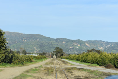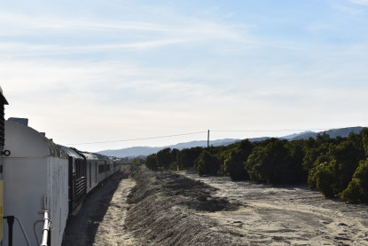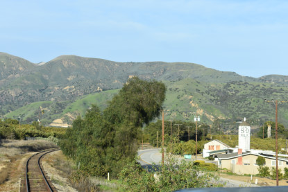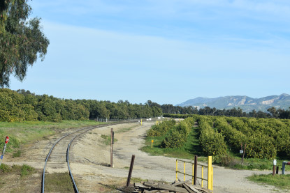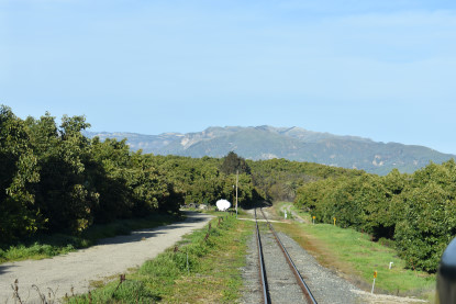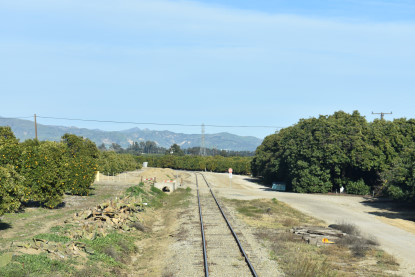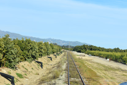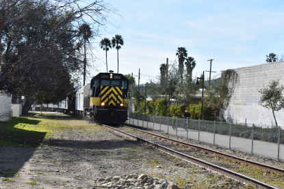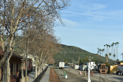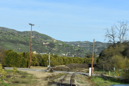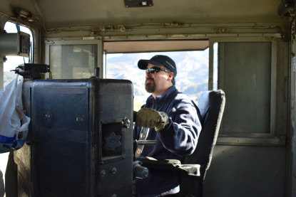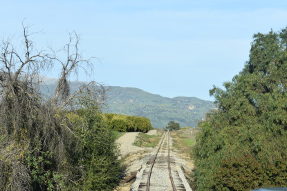 The train returned to Santa Paula to pick us all up. I returned to the open air car while John and Skip choose the coach to stay out of the wind. The train departed and headed back east to the Loose Caboose for a thirty-minute stop. The engineer came through the open air car and saw me, asked if I wanted a cab ride and I said "Yes!" He was going to get some food and would pick me up on his return to the engine. I enjoyed a lady and her son who was making his first train trip. I gave her my card and we talked for several minutes. All too soon, the engineer came by and we walked through the crew car and out onto the engine and he unlocked the cab to let me in. We talked about his job at Disney and I learned that we had a mutual friend in Matt Melzer. Soon the horn was blown for a five minute warning. I told him of my future plans which he was impressed with. Soon we heard over the radio "highball" and we slowly started moving. He told me to take all the pictures I wanted, so I did just that.