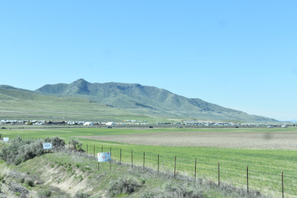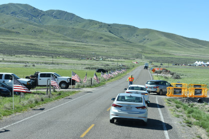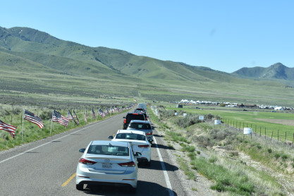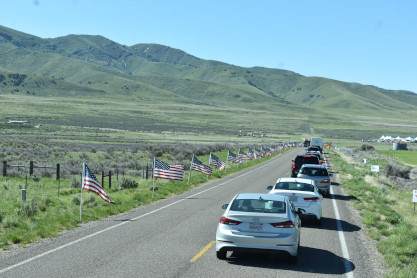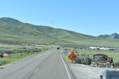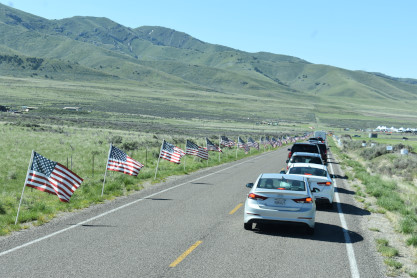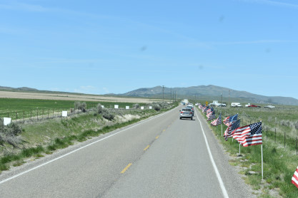 Our NRHS VisitWe flew up the freeway but when we got onto Utah 18, we encountered traffic that was bumper-to-bumper heading to Promontory. A Walmart truck was right in front of us and he had to put up with all the people heading to Promontory instead of his usual light traffic on this road. We came to a curve where there were people handing out information which was the cause of the slowdown. We arrived at the park and I pointed out the Big Fill and the abandoned grades to my passengers. We continued onward until we made the final turn toward Promontory where we were greeted by a mile of a American flags on the south side of the road only.