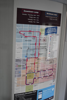 The inside of the Oklahoma Streetcar. The streetcar would stop at or bypass Transit Center, Federal Courthouse, Broadway Avenue, Automobile Alley, Art Park, North Hudson, Dewey Avenue, Midtown, NW 10th Street, Law School, Memorial Museum, Business District, Century Center, Bricktown, Mickey Mantle, East Bricktown, Ballpark, Santa Fe Hub, Arena, Scissortail Park and Myriad Gardens before returning me to Library.