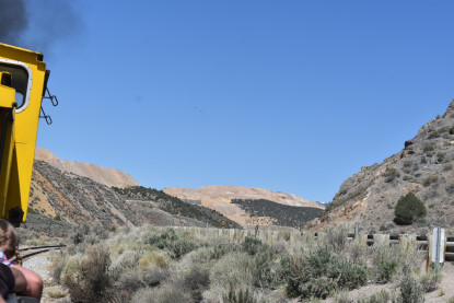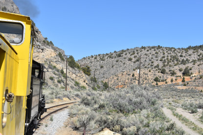 At 9:30 AM the train reversed out of the East Ely station to the switch and passed the wig-wag crossing signal. Once they threw the switch, we were on our way toward Keystone. This is my third trip on the Nevada Northern and Robin's first.