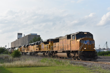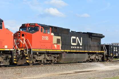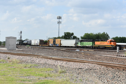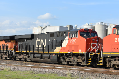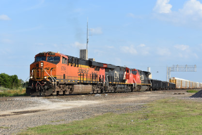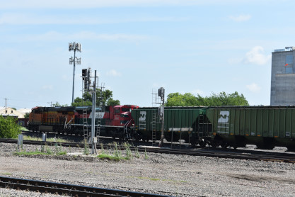 BNSF 6784 West, with CN 2990 and 2155 in its consist, heads north.