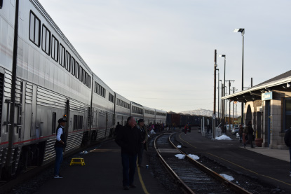 3/14/2019 I awoke at Bray and went straight to the dining car for a breakfast of pancakes and pork sausage with my two usual dining mates. The conversations were good and then I sat at a table in the lounge car the rest of the way to Klamath Falls where I took a cold fresh air break.