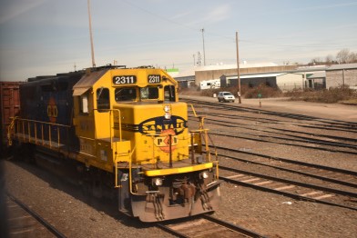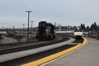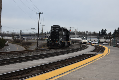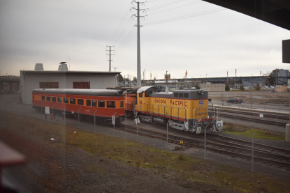 Portland and Western GP39-2 2311 and train in Albany. The train next ran onto Salem slowing down for grade crossing work on the way. After Salem I had to fill out an Amtrak Accident Report then returned to my room while the train stopped at Hito for the southbound Coast Starlight Train 11. Following that we ran north toward Portland. Today's delays have all been waiting on other Amtrak trains. We ran to Johnson Creek where our first freight train delayed us - Union Pacific 5462 South. From here we continued to Portland Union Station and the final fresh air stop of this trip.