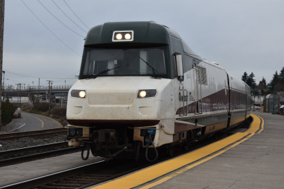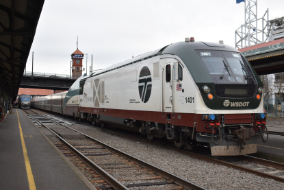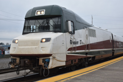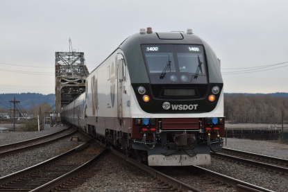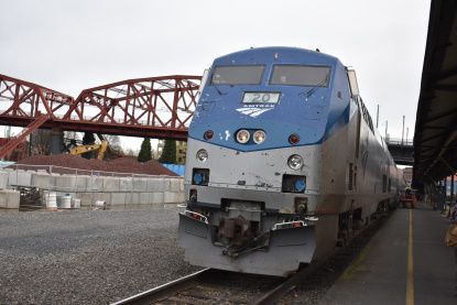 Cascades Charger 1401 at Portland. We loaded our new passengers and departed at 5:11 PM {4:00 PM}, making the eighteen minute trip across the Willamette River and Columbia River to our detraining station of Vancouver. It had been an excellent Amtrak adventure and with Chris Parker in Vancouver waiting for us, it is a case of "I love it when a plan comes together!"
