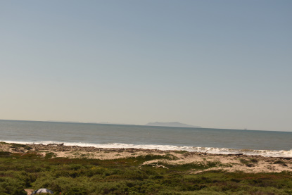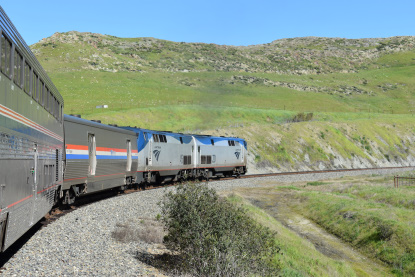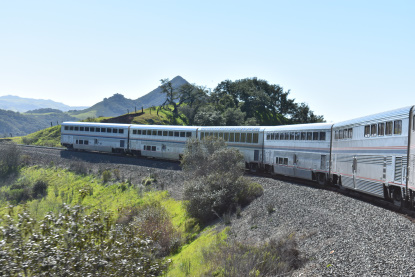 All of the Channel Islands can be seen from these views just west of Ventura. At noon we were called into the dining car where we were seated with a couple from La Porte, Indiana who have been to Hesston and North Judson railroad museums. They were on a Amtrak circle trip to see their grandchildren. I enjoyed the Angus beef burger and vanilla pudding for a most filling lunch then took a fresh air break at Santa Barbara before the train left and headed to San Luis Obispo. Proceeding west to Point Conception, the Starlight then turned north to Vanderburg Air Force Base and I went to the lounge car and sat at the rear table to enjoy the crossing of the base. I returned to the room just before Casmila where Robin and I listened to music as we neared San Luis Obispo then took a fresh air break at San Luis Obispo this afternoon of over half an hour. We departed on time, learning that our southbound counterpart was over five hours late. Now we would climb Cuesta Grade.