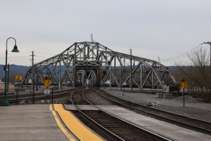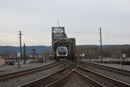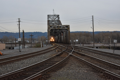 The Oakridge Covered Bridge is really the Office Covered Bridge. We ran through the downed tree zone where many trees have cone down the slope. Lookout Point Reservoir was the lowest in years but waiting for the spring melt to fill it up. We made our way into Eugene, our next fresh air break of this trip. Next we would be running to Albany where we might be eating lunch as the two of us had a 1:30 PM reservation. As I walked to the dining car, the train rocked violently and I was tossed into a corridor post and cut my arm. The fantastic dining car staff brought me alcohol wipes and a bandage which did the trick. We ran to Hallawell where I ate my Angus beef burger and chocolate cake while we waited for the late-running Cascades 511. Once he passed us, we backed out of the siding and continued on to Albany.