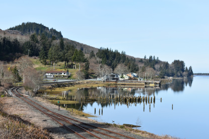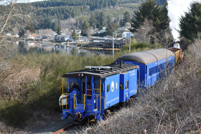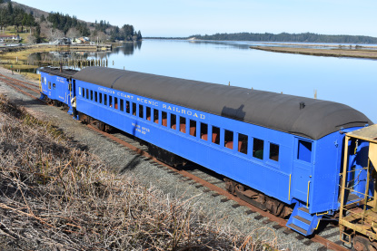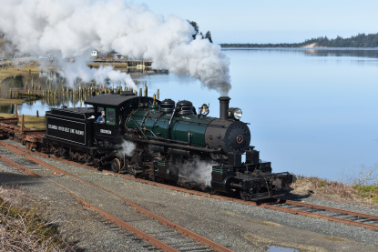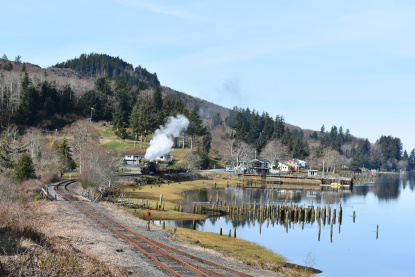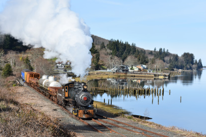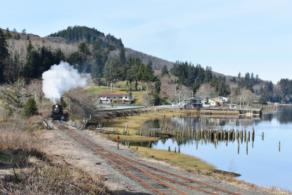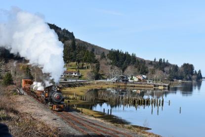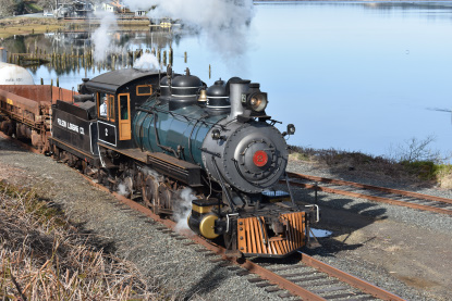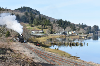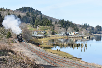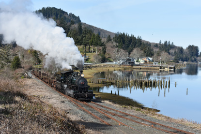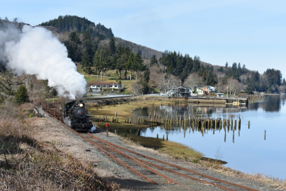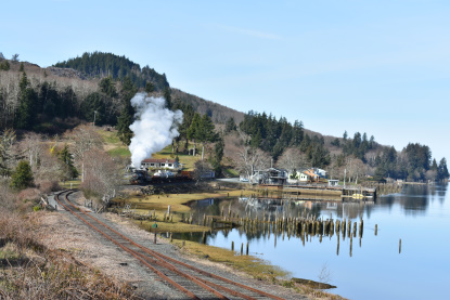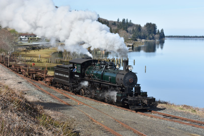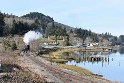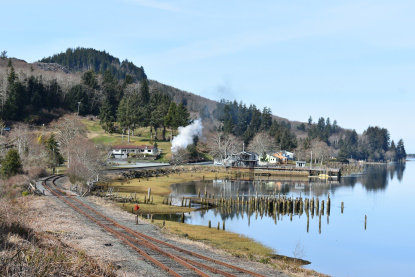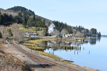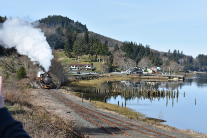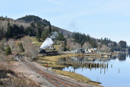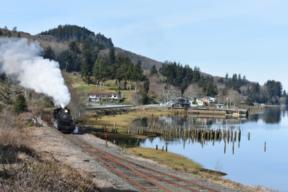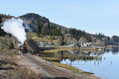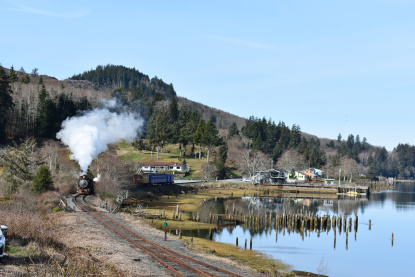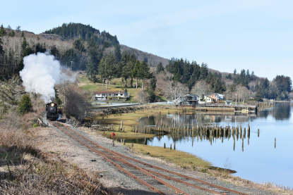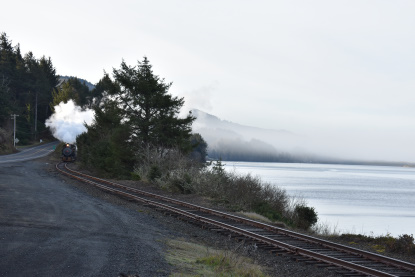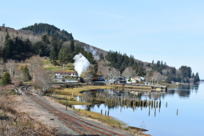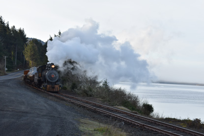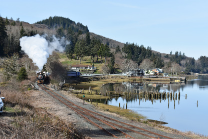The former Spokane, Portland and Seattle Astoria Branch still in use by the Astoria Waterfront Trolley. We drove down to Fred Meyer in Warrenton to get petrol before we drove to find a steam train. Some of the views along the route were quite stunning. We arrived at the tracks and all eyes were then focussed on the railroad, except for Bob who was driving. We drove south to Wheeler by the cove, by a nice photo location and after that, we found the Trains Magazine Oregon Coast Scenic charter train with Polson Logging 2-8-2 2. We made a U-turn and returned to the other photo spot.