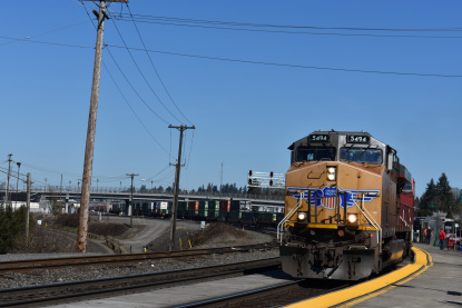 Cascades Talgo 506 arrived in Albany. I was directed to Car 3 and took an east side seat. Robin was having his first Talgo experience and he and Chris explored the Talgo cars and Robin received a good introduction as they sat in the Bistro car. Elizabeth and I remained in our coach seats and enjoyed the trip; Elizabeth had not ridden this part of the Cascades route before. We ran to Salem, departed five minutes late and headed down the rails. Talgo trains still have wireless Internet which makes train surfing very easy. The train went through Woodburn with its steam engine and Canby with a depot, caboose and wig wag before we passed two Oregon Pacific switchers, then we went past Willamette Falls and ran into Oregon City, our next station stop. Now we would run along the Milwaukie MAX light rail line and through Union Pacific's Brooklyn Yard, then by the Oregon Rail Heritage Center before crossing the Willamette River into Portland Union Station, where the train filled up with passengers. Chris Parker detrained here and would take MAX out to the airport. The three of us would leave Portland, cross the Willamette River then the Columbia River into Washington to Vancouver where Robin and I would detrain, leaving Elizabeth onboard to ride to Seattle without us. We detrained in Vancouver, two very happy train riders after an excellent trip aboard Amtrak Cascades 506.
