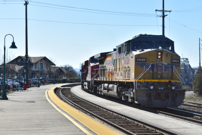 The Coast Starlight arrived in Vancouver. We were greeted by Santi and went to room 2 in the 32003 sleeper. Our consist for this trip was Engines 186 and Big Game 50, Viewliner Baggage 61049, transition car 39014, sleepers 32003 "Edward L. Ullman" and 32050, diner 38059, Business Class 34504, lounge 33046 and coach 34059. We sat in the room and then I heard "Christopher second call" so we went to the dining car where I had an Angus beef furger for lunch which was excellent. We ran to Portland and I walked around before I turned on the computer and wrote the last part of this story before we departed on time. The train escaped Portland and ran south to Coalca where we met the northbound Coast Starlight. The train continued to Salem and onto Albany while I looked at the Route of the Chiefs book I had bought at Winterail. I listened to Ian Anderson's "Rupi Dance" as we rolled south down the Willamette Valley. It does not get any better than this. We stopped in the siding at Alford to wait on Amtrak Cascades 508 to pass us, then followed a Union Pacific freight before we made our way to Eugene, our second fresh air stop of this trip. Later at Natron we met a northbound Union Pacific freight train.