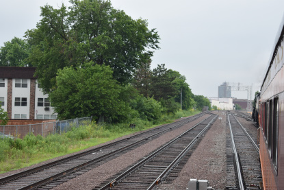 Milwaukee Road 261 took the southeast leg of the Minneapolis Junction wye as the rain began but subsided once we were out of the Twin Cities area.