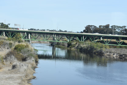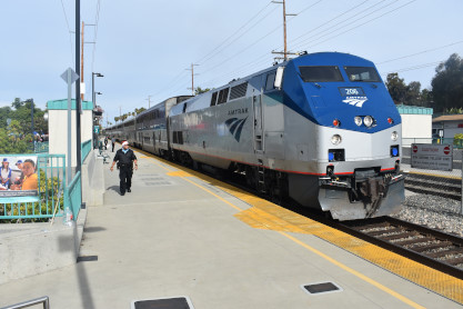 We crossed the San Luis Rey River before we arriving at Oceanside where we went to the platform at the south end so the engineer could switch ends. No one was allowed off and we soon departed, following Pacific Surfliner 1563 north.