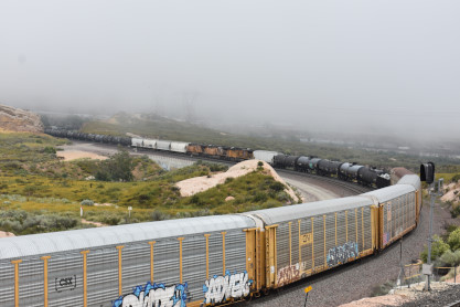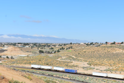 Since Elizabeth caught only one train at Blu Cut on her visit to Cajon Pass on the trip down from Washington, we decided to take her back and take her to some of our favorite spots. We met Bill out in front of our apartment and then drove straight out to the hill that overlooks the Frost flyover. Once we arrived, it was cold and windy and I was not properly dressed for it. We did not have to wait very long for our first train of the day.