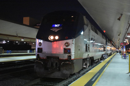 This train had a consist of P42DC 147 and 61, Sleeping Cars 32076 "Delaware" and 32111 "Texas", Dining Car 38021, Lounge 33009, coaches 34086, 34136, baggage-coach 31031 and coach 34047. We had Deluxe Room A with Steven as our attendant. We relaxed in the room until the train departed at 6:00 PM and we headed out in the evening.