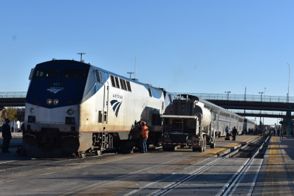 Southwest Chief being refueled at Albuquerque. This was my latest eastbound trip ever. We left at 4:24 PM {11:48 AM} and headed to Lamy.