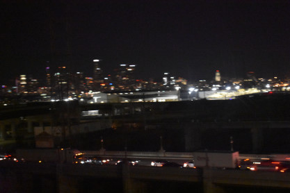 The skyline of downtown Los Angeles taken from the flyover over the Los Angeles River. We received a 7:00 PM dinner reservation so we would eat after Fullerton. The train stopped in Fullerton and Elizabeth and I went down to the door to see our good friend David Aten who had come to see us off. This was very nice of him to do such a thing. The train next headed out through Santa Ana Canyon to Corona and on to our next stop at Riverside. At 7:00 PM, we were called into the dining room for dinner. I had braised beef which was not really enough for me and Elizabeth had her usual chicken fettucine, which she enjoyed. This dinner was brought in a bag but the attendant was very likeable and pleasant, unlike the attendant on the Coast Starlight last month. The train stopped in Riverside and I saw Hayward, the conductor on Metrolink 815 and 812, as well as his female assistant conductor. After dinner, I went down and talked with Anthony, the lounge car LSA, a long-time Amtrak employee who has served me all the way back to the San Diegan days on Amtrak and who, on the Surfliner, amused all the passengers with his singing. I have known him for over twenty-five years and he has always treated me with respect and gives the best service to me, as he will on this trip.