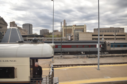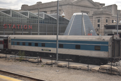 Union Pacific five double bedroom/lounge/buffet car "Ogden" built by Pullman-Standard in 1956. It was re-designated by the railroad as staff car 126 in 1967 and sold to Great Western Enterprises in 1971, where it became the 126 "Redwood" and was later sold to Chicago Medical Equipment and named "Silver Foot" since CME was owned by a group of podiatrists. It was later assigned Amtrak 800279 and was rebuilt into an open-platform car. We went past Kansas City Union Station before we backed into it and they added two private cars, Warren R. Henry and Evelyn A. Henry, to the rear of our train. After doing the business here, the Southwest Chief departed at 11:18 AM {8:15 AM}. It was here that Elizabeth's new mileage ended until we arrive at La Plata.