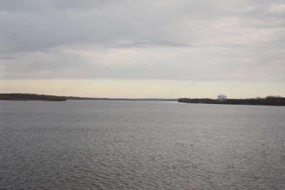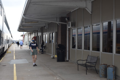 Elizabeth at Fort Madison. The train left then headed to the Mississippi River drawbridge. Elizabeth went back to the lounge car to enjoy the trip through Fort Madison, seeing the steam engine from the train and her first time over the bridge.