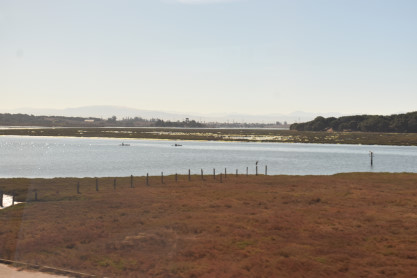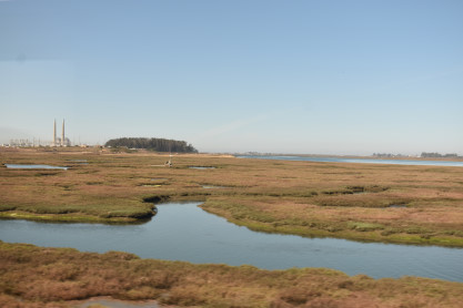 Elizabeth at the Elkhorn Slough. I got my lunch of chicken tenders, pretzels and a root beer with a chocolate chip cookie from the lounge car. The train headed to Salinas, a long fresh air break.