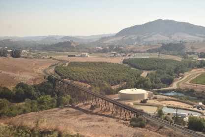 Catenary poles and hangers for Caltrain's electrification project, as well as an out-of-service Capitol train set. The train left San Jose on time and headed south through Gilroy and then the Pajora Gap where the tracks cross the San Andreas Fault.